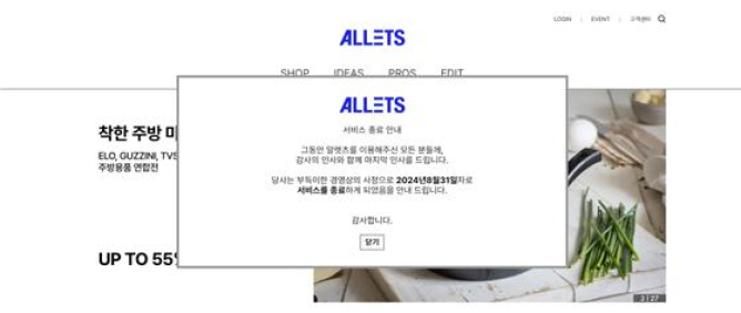 19일 업계에 따르면 알렛츠는 지난 16일 자사 홈페이지에 “당사는 부득이한 경영상의 사정으로 2024년8월31일자로 서비스를 종료하게 되었음을 안내 드린다”고 공지했다. 입점 업체에 따르면 16일은 알렛츠 플랫폼의 중간 정산일이다. 현재 알렛츠 직원 40여명은 모두 퇴사 절차를 밟아 고객을 응대할 CS조차 남지 않은 것으로 알려졌다.
