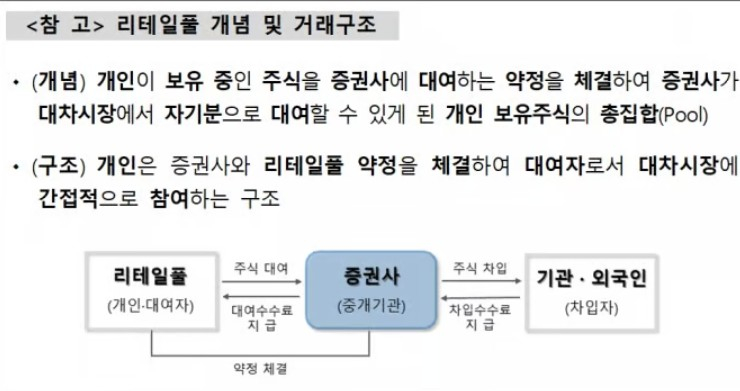 리테일풀은 개인이 보유 중인 주식을 증권사에 대여하는 약정을 체결한 이후, 증권사가 대차시장에서 자기분으로 대여할 수 있게 된 개인 보유주식의 총집합을 말한다. 특정 종목에 대해 차입 수요가 생기면 증권사는 리테일풀에서 주식을 빌려주고, 투자자는 대여자로서 대차시장에 간접적으로 참여하는 구조다.