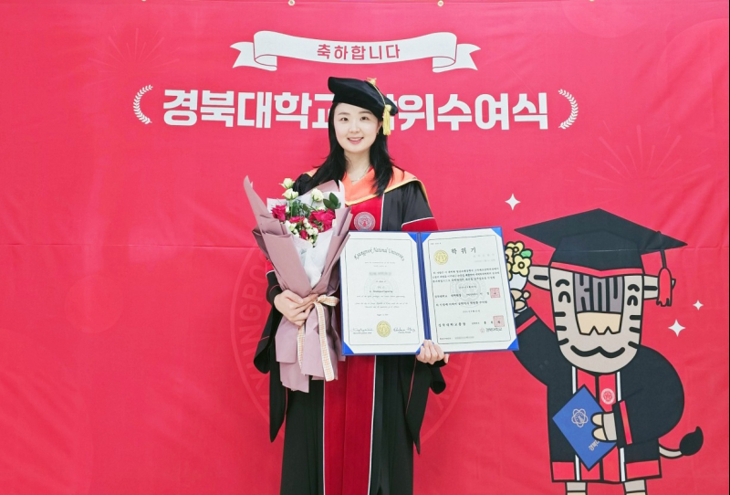 지난 23일 열린 경북대 학위수여식에서 박사학위를 취득한 김현지씨가 마그네슘의 조직 제어와 기계적 특성 향상 연구로 박사학위 과정 동안 총 20편의 논문을 발표하고 3건의 특허를 출원 및 등록했다.