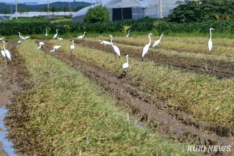 강원도 철원 들녘 곳곳은 콤바인이 힘차게 돌아가고 있다. 백로무리들 역시 미꾸라지 맛집을 찾아 들판 여기저기를 기웃거린다.