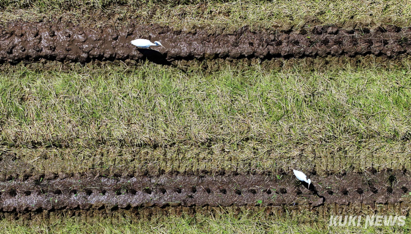 “지난 4월 25일에 모를 심고 4달 만에 수확한다. 백로 떼가 벼를 베는 콤바인 옆에서 저렇게 열심히 미꾸라지를 잡아먹는 모습이 보니 우리 논이 건강하다는 생각이 든다”