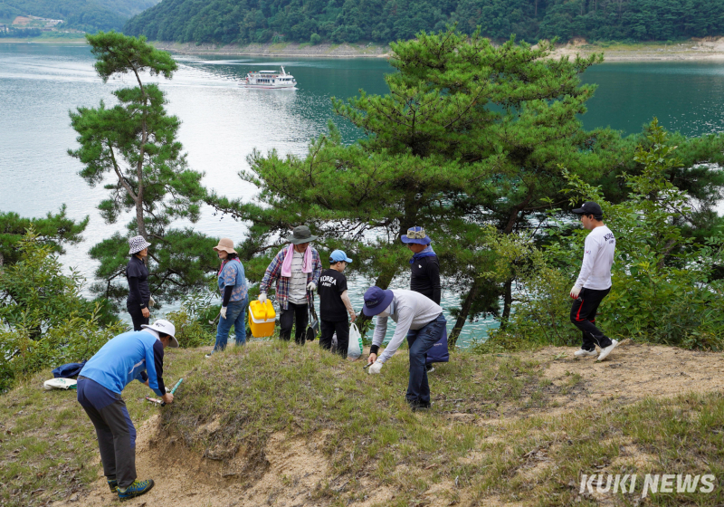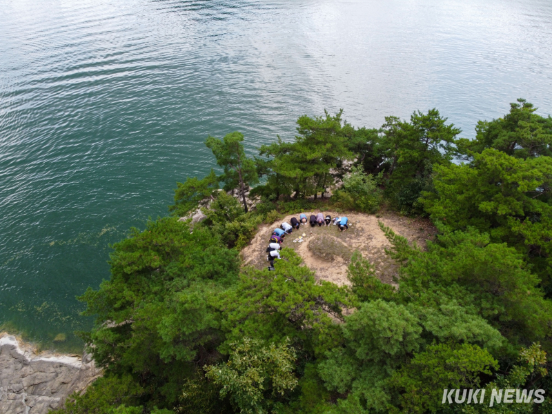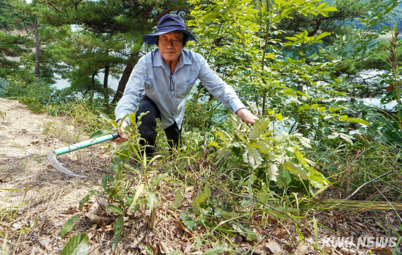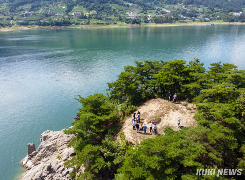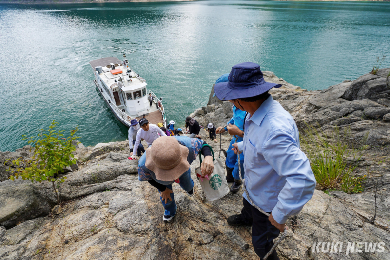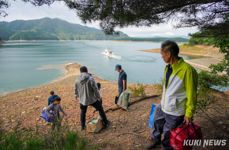 이날 안 씨 가족이 찾은 묘소는 어머니가 스스로 택한 묏자리다. 장남인 안수호(69) 씨는 "당시에는 산세가 험해서 몰랐는데, 물에 잠기니 명당이 됐다"며 어머니의 선견지명이 있었던 것 같다고 회상했다. 그의 말처럼 묘소로 가는 길은 험했다. 수석이 많던 남한강 지형처럼 배가 접안한 곳에는 단단한 암반이 자리했다. 앞장선 남자 형제들은 바닥에 납작 엎드린 채 네 발로 기어 올라가 작년에 묶어둔 나일론 밧줄을 찾아 내렸다. 안정래 씨는 오빠가 내려준 밧줄에 의지해 40년 만에 어머니의 묘소와 마주했다.
