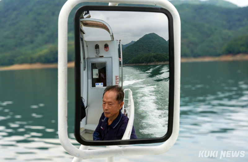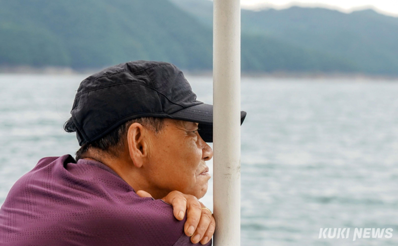 지난 7일 충북 충주시 청풍호 일원에 위치한 영진호 선박 위에서 최정훈 씨가 물에 잠긴 고향을 바라보며 상념에 잠겨 있다.