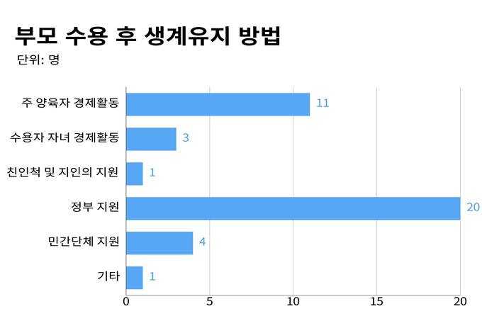수용자 자녀는 주로 정부 지원을 통해 경제적 어려움을 해결하고 있었다. 본지 설문조사에 따르면 50%(20명)의 자녀가 기초생활수급비, 한부모 가정 지원 등을 통해 생계를 유지했다. 수용되지 않은 양육자의 경제활동(11명), 민간단체 지원(4명) 등도 주요 생계유지 방법으로 제시됐다.