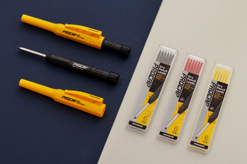이번에 새롭게 선보이는 프로캡 드라이 펜슬 마카는 샤프펜슬 노크 타입으로, 2.8mm 지름의 흑연심을 적용해 나무 또는 타일 재단 작업 시 정교한 작업이 가능한 것이 특징이다.