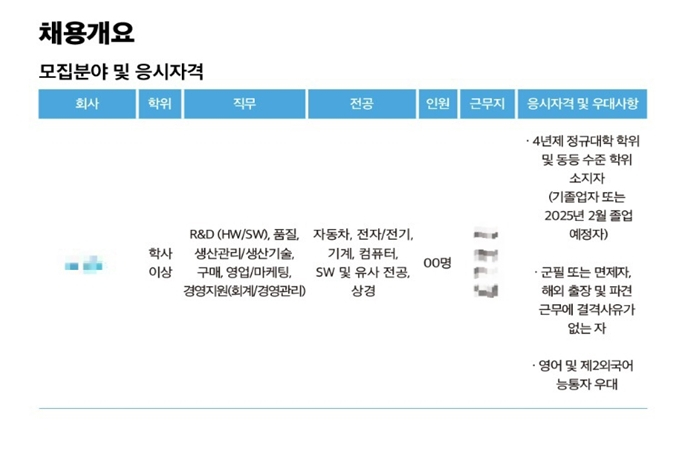 잡코리아의 ‘1000대 기업 채용 공고’를 살펴보면, A 기업은 모집 분야를 ‘생산·품질관리’로 기재하고, 담당 직무 또한 ‘생산·품질관리’라고 적었다. 자격 요건 및 우대 사항에는 ‘초대졸 이상’, ‘관련 학과 졸업자’라고만 간단히 명시했다. 또 다른 B 기업은 우대 사항으로 ‘관련 자격증이나 공모전 수상 경험’만을 기재했다.