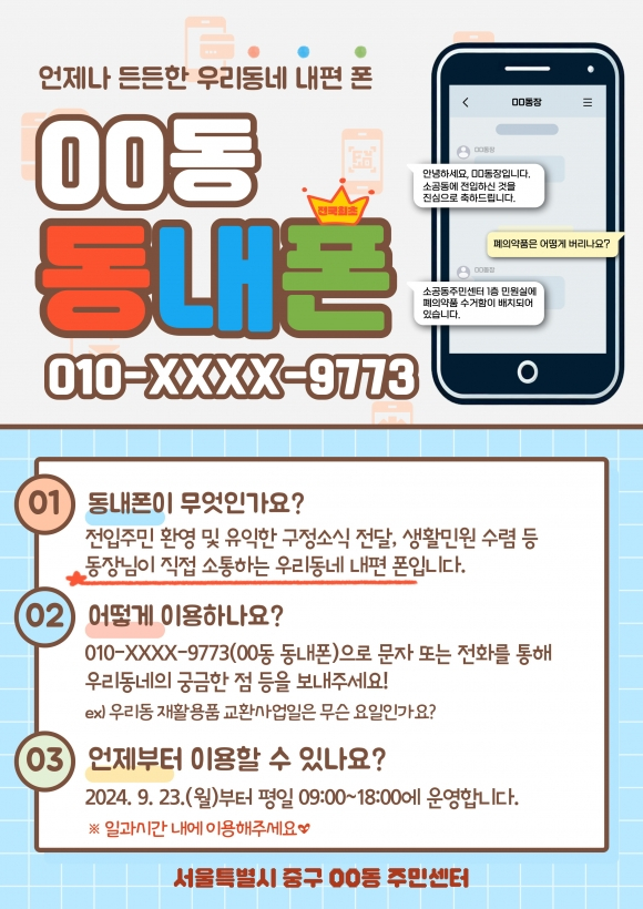 구는 ‘우리 동의 언제나 든든한 내편 폰’을 23일부터 운영한다고 밝혔다. 평일 오전 9시부터 오후 6시까지 동내폰을 운영해 쓰레기 배출 시간 등 사소한 생활 정보부터 민원 사항까지 문자와 전화로 주민과 직접 소통한다.