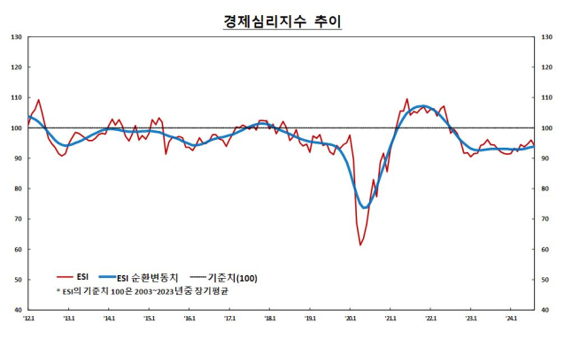 한편 기업경기실사지수(BSI)와 함께 소비자동향지수(CSI)를 반영한 경제심리지수(ESI)는 전월보다 0.5p 하락한 93.7을 기록했다. 다만, 계절적 요인을 제거한 ESI 순환변동치는 93.6으로 소폭 상승했다.