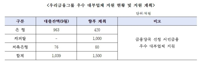 자회사별 지원금액은 우리은행 420억원, 우리금융캐피탈 1000억원, 우리저축은행 80억원 등이다.