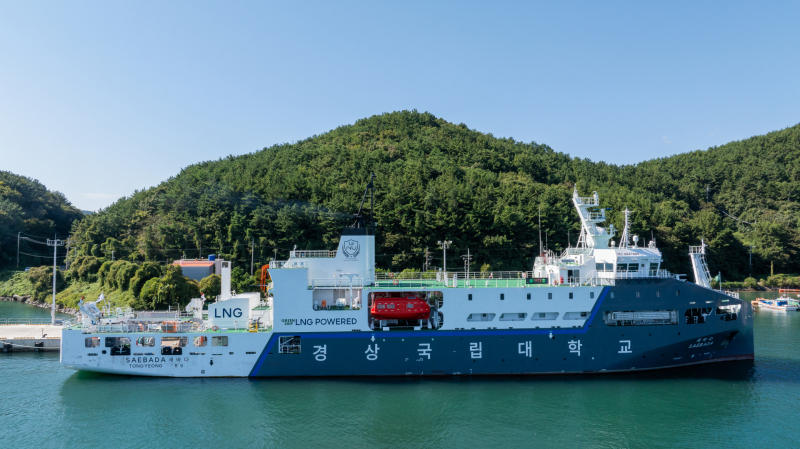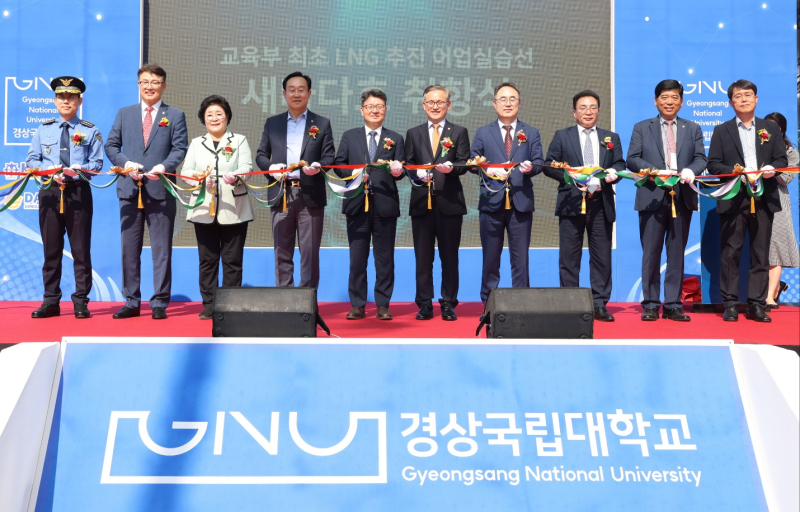 경상국립대는 11일 오후 1시 경남 통영시 경상국립대 해양과학대학 실습선 접안부두에서 '교육부 최초 액화천연가스(LNG) 추진 어업실습선 새바다호 취항식'을 개최했다. 행사에는 경상국립대, 교육부, 경상남도, 통영시, 국회의원 등 300여 명이 참석해 새바다호의 출항을 축하하고 안전 운항을 기원했다.