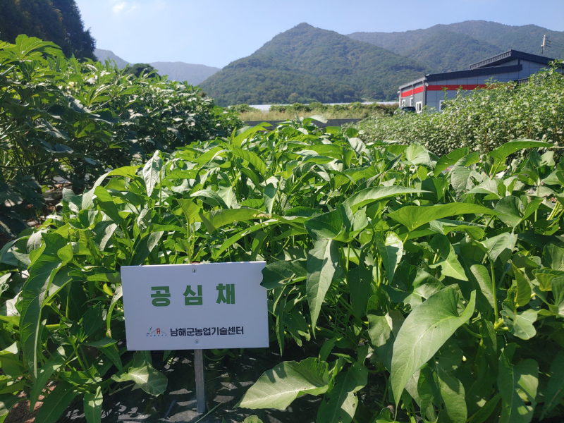 남해군은 기후변화에 대응하기 위해 공심채를 포함한 5종의 아열대 채소(인디언시금치, 오크라, 여주, 몰로키아)를 노지에서 시범 재배하고 있다.