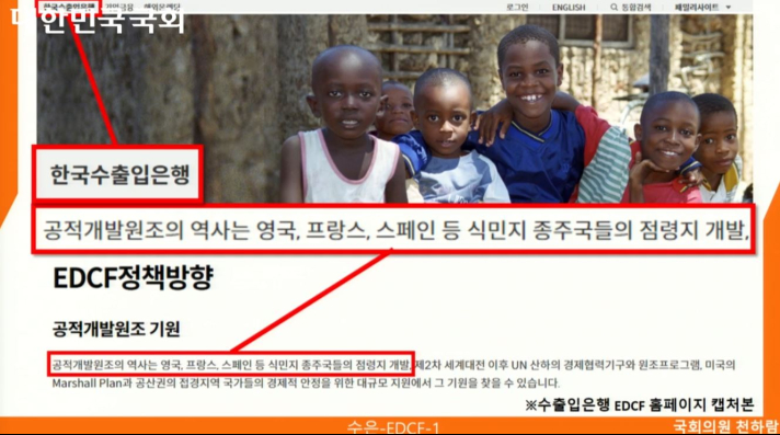 21일 기획재정위원회 국정감사에서 천하람 개혁신당 의원은 “수출입은행 EDCF 홈페이지를 보면 식민지 종주국들의 점령지 개발이 공적개발원조(ODA)의 시발점이라고 써놓았다”며 “이 논리대로라면 일본제국이 한반도에 공장 짓고 도로 짓고 한 것도 ODA라는 말이 된다”고 지적했다.
