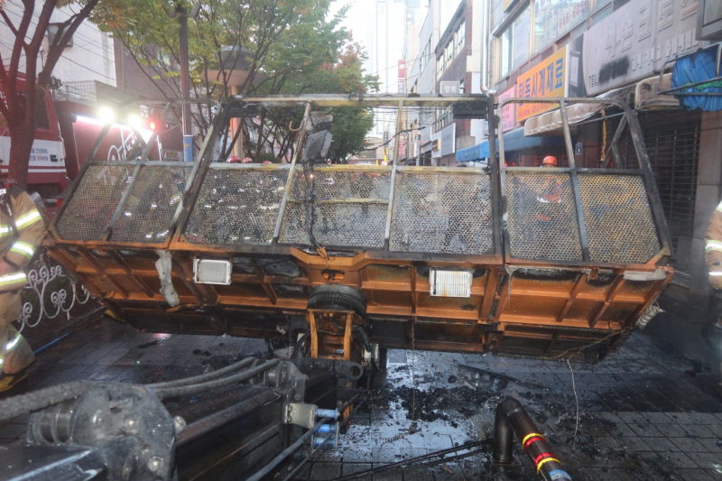 31일 부산소방본부에 따르면, 전날(30일) 오전 6시 26분쯤 부산진구 범천동의 한 인도 위에 정차해 있던 소형 사다리차 바스켓에서 불이 났다.