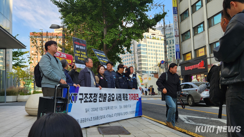 제2노조인 KT새노조와 참여연대, 민생경제연구소 등은 31일 오전 10시 서울 광화문 KT 사옥 앞에서 기자회견을 열고 KT가 자회사 전출 대상자에게 전출 신청을 강요하고 있다며 사과와 함께 강요 행위 중단을 촉구했다.