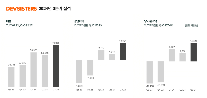 데브시스터즈는 2024년 3분기 매출 720억원, 영업이익 134억원, 당기순이익 143억원을 기록했다. 지난 6월26일 글로벌 출시 후 추가 매출원으로 안착한 쿠키런: 모험의 탑이 이번 분기 실적 향상을 이끌었다. 신작 효과에 따라 전 분기 대비 매출은 32.2%, 영업이익은 170.9% 증가했다.