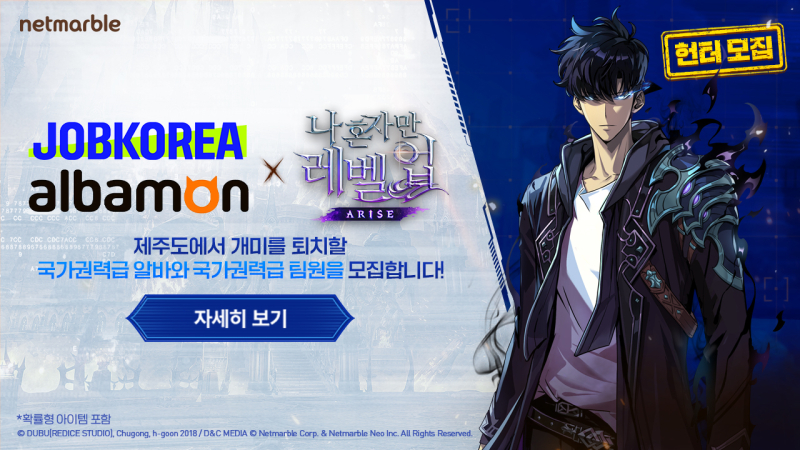 넷마블(대표 권영식·김병규)은 액션 게임 ‘나 혼자만 레벨업:어라이즈’(개발사 넷마블네오)가 대표 커리어 플랫폼 잡코리아, 알바몬과 협업을 통해 오는 12월 업데이트 예정인 ‘제주도 레이드’에 참가할 헌터를 공개모집 한다고 8일 밝혔다.