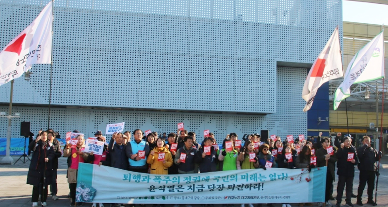 민주노총 대구지역본부와 윤석열퇴진대구시국회의 등은 이날 오전 동대구역 광장에서 기자회견을 열고 윤석열 대통령의 퇴진을 촉구했다.