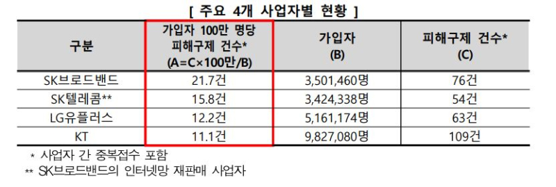 사업자별 분석 결과를 살펴보면 피해구제 신청 447건의 67.6%(302건)가 주요 4개 사업자로 확인됐다. 가입자 100만명당 피해구제 신청은 SKB가 21.7건으로 가장 많았다. SKT 15.8건, LG유플러스 12.2건, KT 11.1건 등이다. SKT는 SKB의 인터넷망 재판매 사업자다.