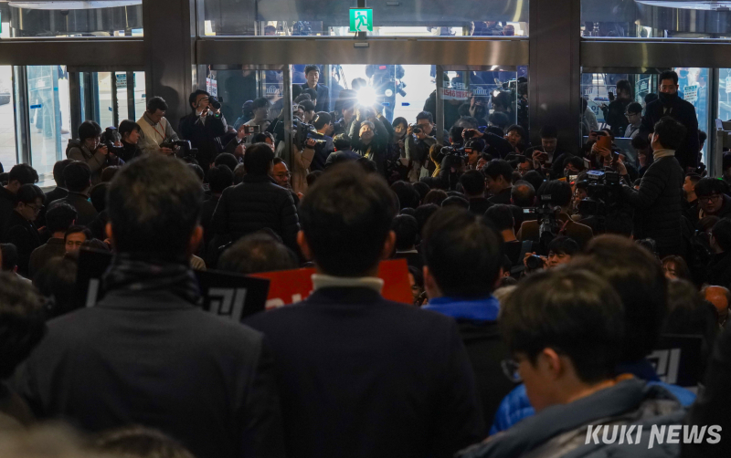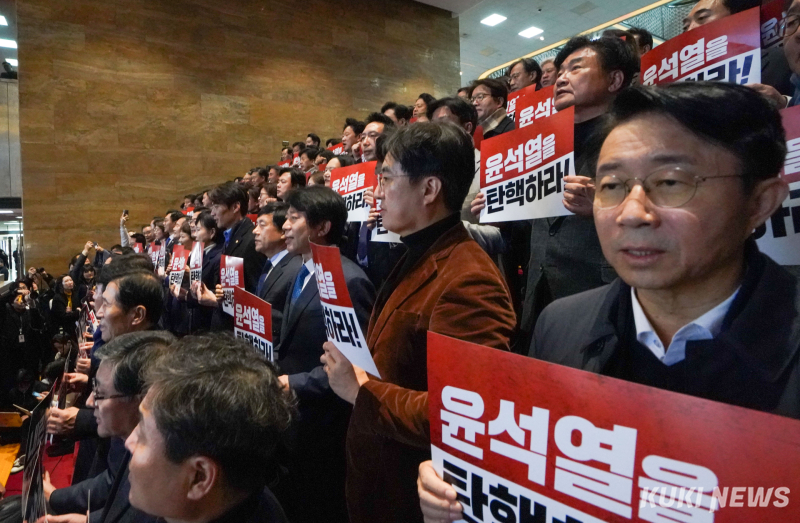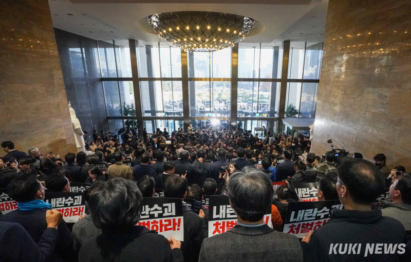 야당 의원들은 이날 오후 3시쯤 윤 대통령이 국회에 방문할 것으로 알려지자 본청 로텐더홀 계단에서 규탄 대회를 열고 "내란 수괴 윤석열을 체포하라"고 외쳤다. 박찬대 민주당 원내대표와 조국 조국혁신당 대표, 용혜인 기본소득당 대표 등 야당 지도부를 중심으로 야당 의원들과 보좌진은 스크럼을 짜고 출입 저지선을 만들었다.
