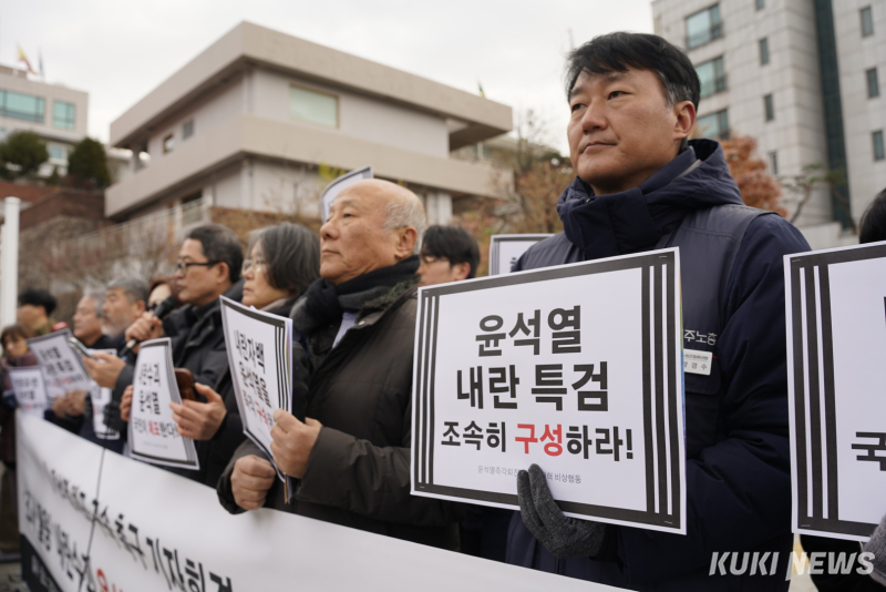 윤복남 민변 회장은 “아직도 내란수괴 윤석열에 대한 신병확보가 이뤄지지 않고 있다”며 “내란 행위가 발생한 지 2주가 다 돼 가는 상황에서 소환통보만 반복하거나 강제수사를 사실상 포기하는 등 수사기관이 보여주는 소극적 행보는 결국 윤석열과 그 관련자들에게 증거 인멸의 시간만 벌어줄 것”이라고 지적했다. 이어 “전날 공조수사본부는 윤석열에 대한 소환조사를 통보하려 했으나 수령을 거부당했다”며 “수사기관 출석에 응하지 않을 가능성도 높다”고 우려했다.