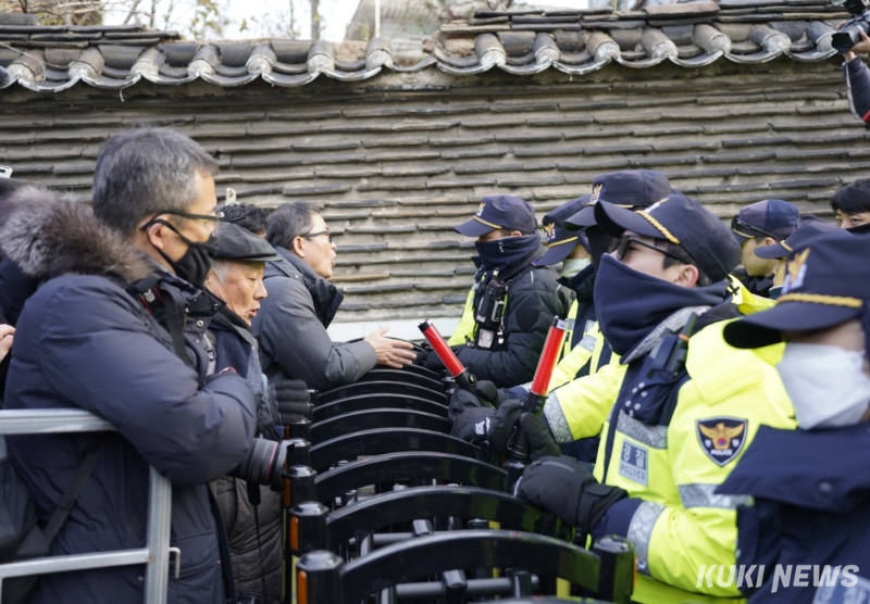 이들은 기자회견을 마친 후 10시25분쯤 대통령 관저 방향으로 향했으나 경찰의 통제에 막혔다. 기자회견을 모두 마무리하고 귀가하던 중이었다. 시민단체가 도로를 우회해 귀가하면서 큰 충돌은 발생하지 않았으나 10여분간 대치는 이어졌다. 참가자들은 “인도도 대통령의 사유지냐” “계엄 때는 국회를 막고, 이제는 시민 인도를 막느냐” “위법 아니냐”고 목소리를 높여 항의했다. 경찰 측은 “(단체) 집행부에 얘기했다”며 선을 그었다.