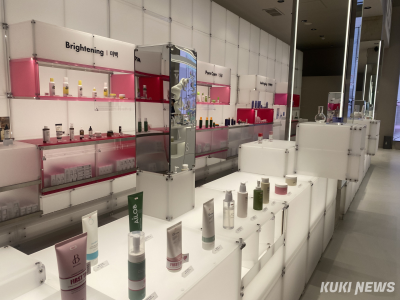 20일 서울 북촌에 위치한 와이레스 플래그십 스토어는 한옥으로 꾸며져 있었다. 1층 카페를 지나 지하로 내려가면 와이레스가 선보이는 화장품을 만나볼 수 있다. 토너, 에센스, 세럼 등 스킨케어 제품부터 파운데이션, 립, 색조 화장품까지 갖춰져 있다. 여유로운 공간에서 고객들이 제품을 둘러볼 수 있도록 제품 간 간격도 넓혔다.