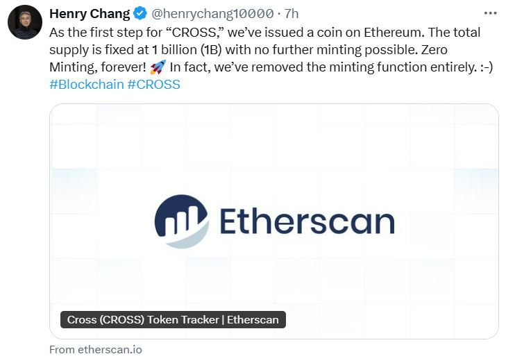 7일 장 대표는 자신의 소셜 네트워크 서비스에 “모든 게임이 토큰을 발행하고 모든 이용자가 이를 거래할 수 있는 게임 토큰 프로토콜 ‘크로스’를 출시한다”고 밝혔다. 그는 이더리움 기반 코인인 크로스 총 발행량은 10억 개라고 설명했다. 아울러 추가적인 민팅(발행) 계획은 전혀 없고 발행 기능도 없다.