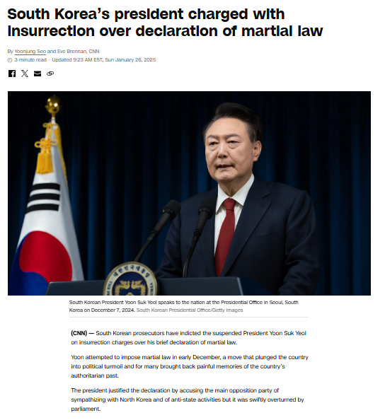 AP통신은 한국의 정치적 혼란을 짚었다. AP통신은 “유죄 판결이 내려지면 사형 또는 종신형에 처할 수 있는 형사 혐의”라며 “계엄령으로 인해 한국은 정치적 혼란에 빠지고, 금융 시장은 흔들리며 국제적 이미지는 손상됐다”고 언급했다. 또한 “이미 심각했던 국가 내부 분열이 더욱 심화됐고, 서울 도심에서는 라이벌 시위대가 정기적으로 집회를 벌이고 있다”고 보도했다.