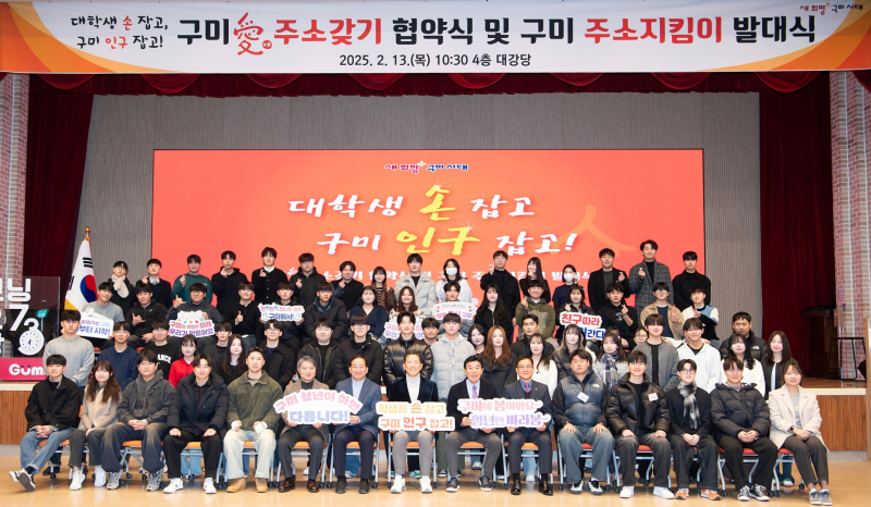 김장호 구미시장은 “서울로 유출되는 학생의 발걸음을 잡기 위해 구미시가 많은 노력을 하고 있다”며 “친구따라 구미간다는 이야기가 나올 수 있도록 대학생과 함께하는 이번 ‘구미愛 주소갖기 운동‘을 반전의 기회로 삼겠다”고 했다.