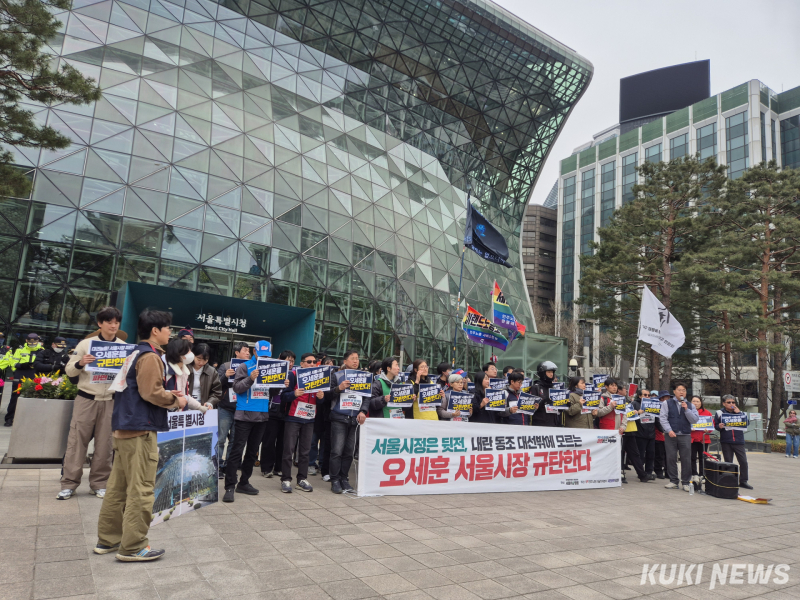 서울시청 앞에서 오세훈 서울시장을 규탄하는 기자회견이 열렸다. 이날 기자회견에서는 “오 시장이 서울시정을 외면한다”는 비판이 나왔다. 참석자들은 최근 강동구 싱크홀 사고를 두고 ‘노동자 안전에 안일했다’고 지적하기도 했다.