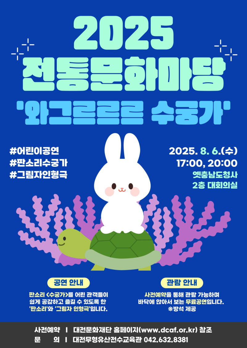 8월 6일 충남도청사 2층 대회의실에서는 판소리 그림자 인형극 '와그르르르 수궁가'공연이 진행된다. 수궁가를 어린 관객들이 이해하기 쉽게 관람할 수 있도록 판소리의 구절과 대사를 알기 쉬운 말로 구성하여 제작한 공연으로 사전예약을 통해 관람이 가능하다.