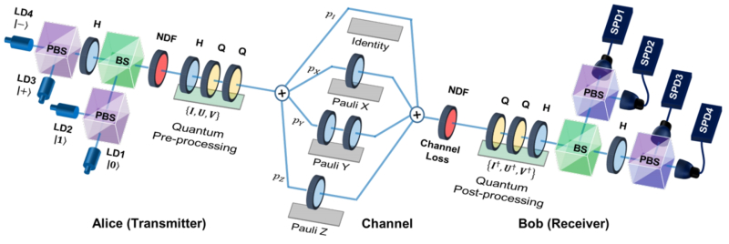 여기에 다양한 편광 노이즈를 삽입해 무선환경의 장거리 실험을 상정, 열악한 상황에서 양자 전송과 측정이 원활함을 검증하고, 송수신 단에 각각 3개의 파장판을 장착해 국부 연산을 구현했다.