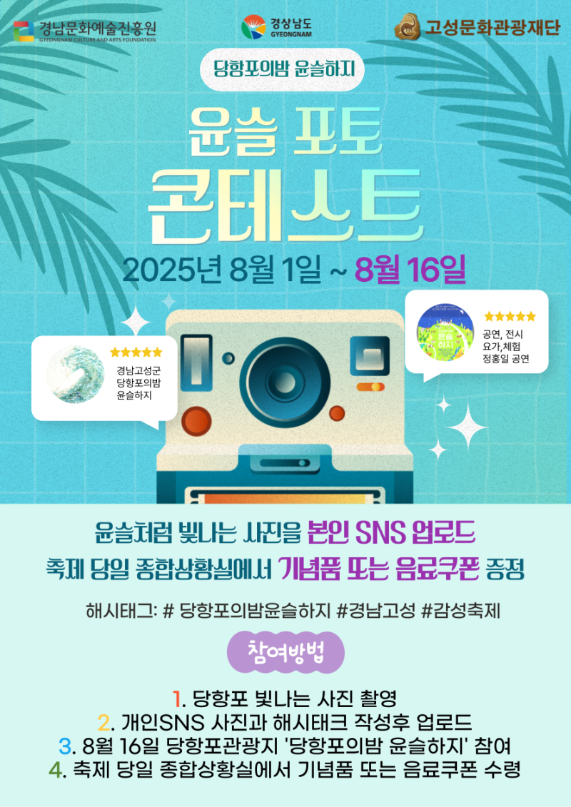 이 행사는 고성 바다의 ‘윤슬’(빛이 물결에 반사되어 반짝이는 모습)을 주제로 당항포관광지의 빛나는 순간을 사진으로 기록하고 공유해 고성의여름을 감성적으로 조명하는 참여형 콘텐츠다.