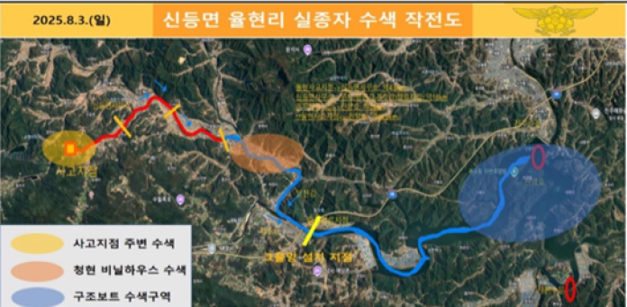 산청소방서는 율현리 인근 하천에서 양천강과 경호강 합류지점인 원지까지 약 20km 구획에 대해 중장비를 동원해 하천변 적재물 걷어내기와 인력 수색작업 중이다.