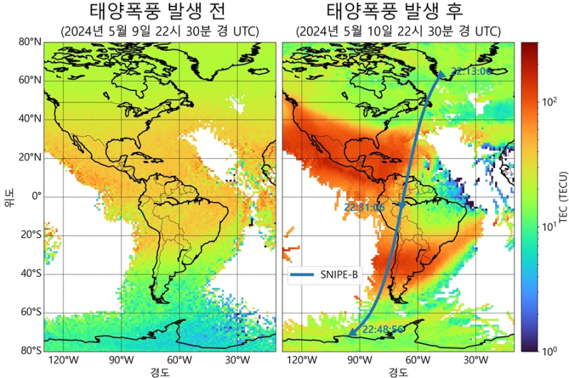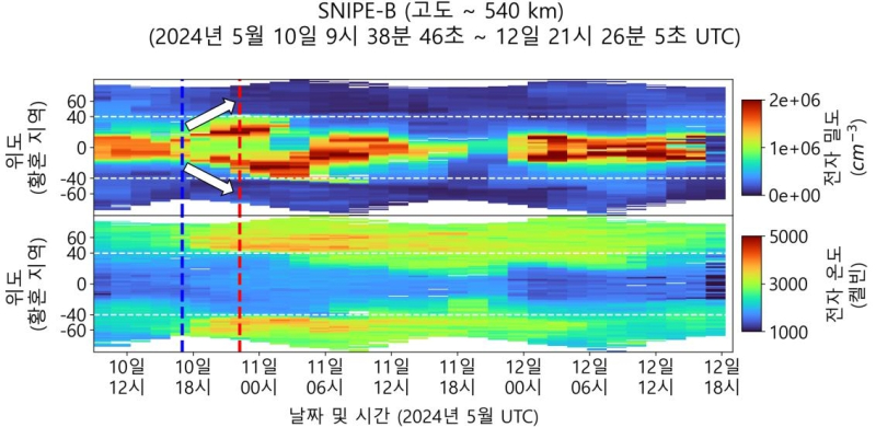 지난해 5월 태양폭풍은 적도지역 플라즈마를 자기 위도 40도까지 이동시켰고, 도요샛과 여러 나라 위성 관측자료를 이용해 이 현상을 포착했다.