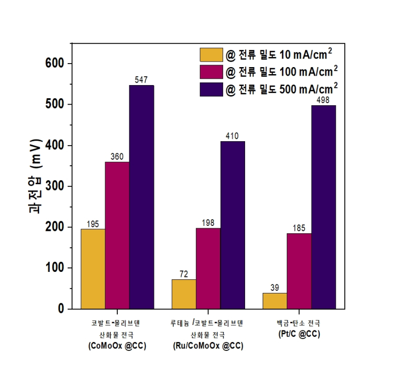 촉매를 포함된 전극은 ㎠ 당 500㎃의 고전류 조건에서도 800시간 이상 연속 운전 시 초기 성능을 유지했다.