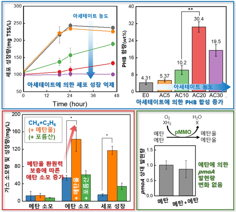 또 에탄은 단독으로 메탄산화균에서 반응하지 않고 세균 역시 에탄만 주어졌을 때는 성장하지 않았지만, 메탄과 함께 존재할 경우 메탄을 산화하는 핵심 효소 ‘입자상 메탄모노옥시게네이스(pMMO)’를 통해 에탄이 함께 산화되는 ‘동시 산화’현상을 관찰했다. 에탄이 산화되는 과정에서 생성되는 중간 대사산물 아세테이트는 메탄산화균의 세포 성장을 억제하는 동시에 PHB 생산을 촉진한다.