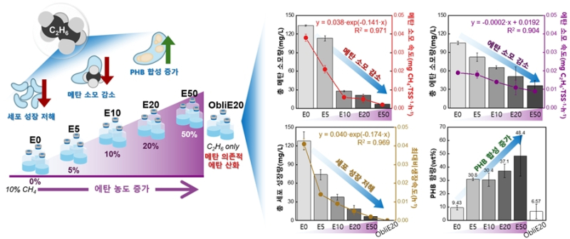 연구팀은 다양한 메탄 및 산소 농도조건에서 에탄을 첨가해 메탄산화균을 배양한 결과 세포성장 억제, 메탄 소비 감소, PHB 합성 증가 등 세 가지 대사반응이 일관되게 나타났고, 이런 변화는 에탄 농도가 증가할수록 두드러짐을 규명했다.