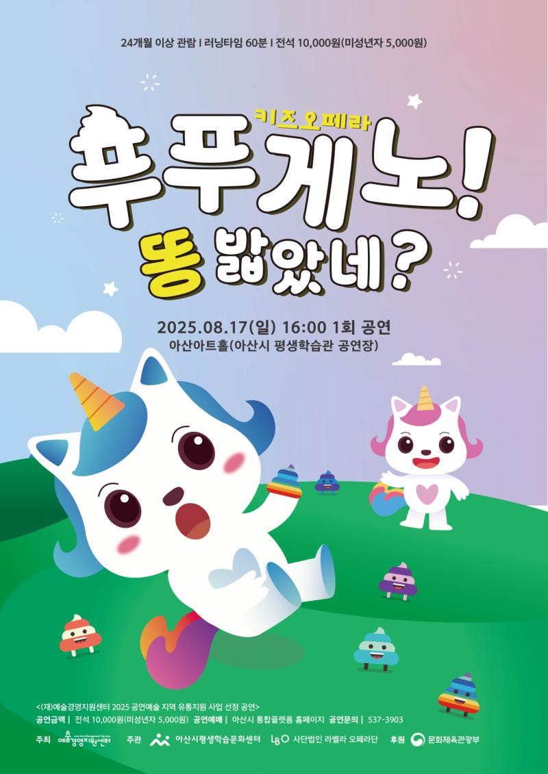 아산시가 2025 공연예술 유통 지원사업에 선정된 키즈오페라 ‘푸푸게노! 똥 밟았네?’를 17일(일) 오후 4시 아산아트홀에서 공연한다.