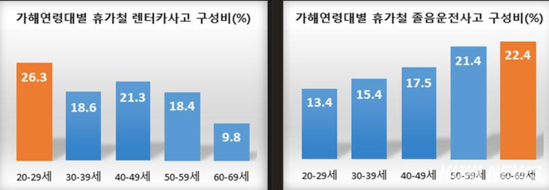 여름 휴가철 렌터카 교통사고에서는 운전경력이 상대적으로 짧은 20대 운전자에 의한 사고(26.3%)와 사망자(44.0%)가 가장 많았다.