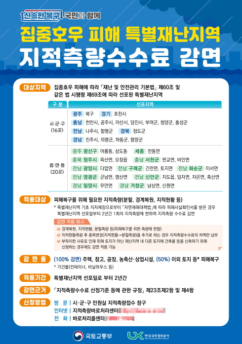 피해민들이 지적측량 신청 시 ‘자연재해대책법’에 따른 피해사항 등을 기재한 ‘피해 사실 확인서’를 제출하면 주거용 주택 등은 100% 그 외의 경우 50% 수수료 감면을 적용받을 수 있다.