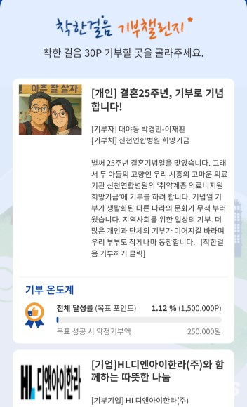 올해 기부 챌린지의 특징은 개인기부가 시작됐다는 점이다. 만보시루 기부 챌린지 개인 기부 2건도 결혼기념일에 맞춰 진행돼 기부 문화의 의미를 더했다.