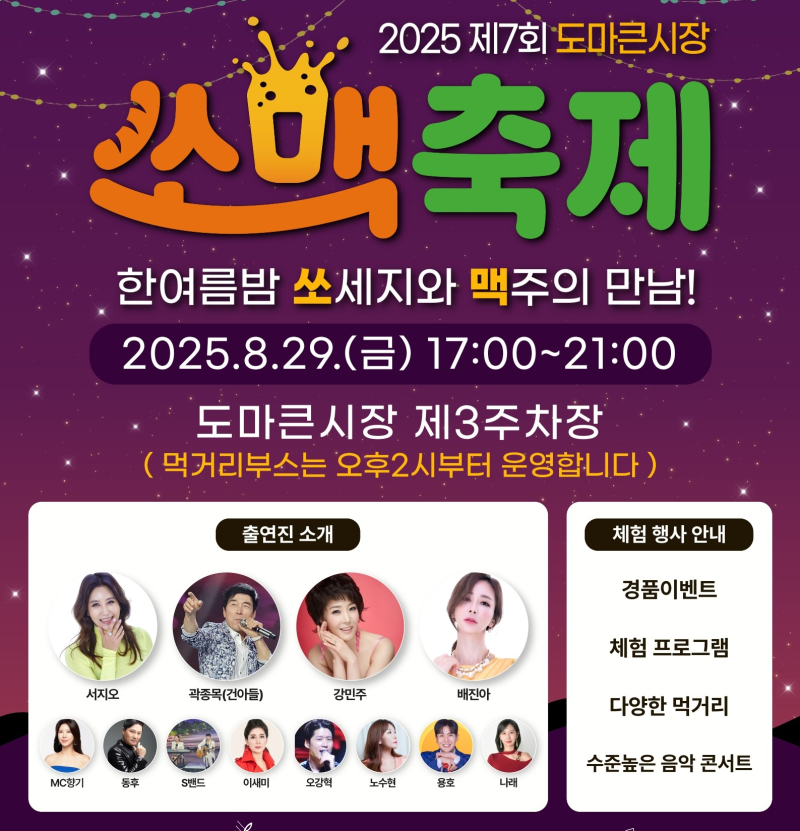 대전 서구는 오는 29일 도마큰시장 제3주차장에서 ‘2025년 제7회 도마큰시장 쏘맥축제’를 개최한다.