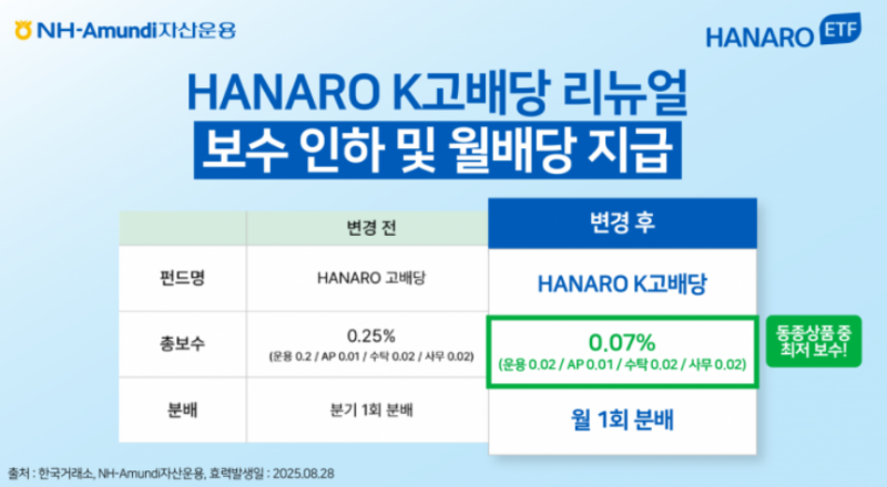 NH-Amundi자산운용은 HANARO 고배당 상품 명칭을 ‘HANARO K고배당’으로 바꾸고 총보수를 0.07%로 낮췄다고 28일 밝혔다.