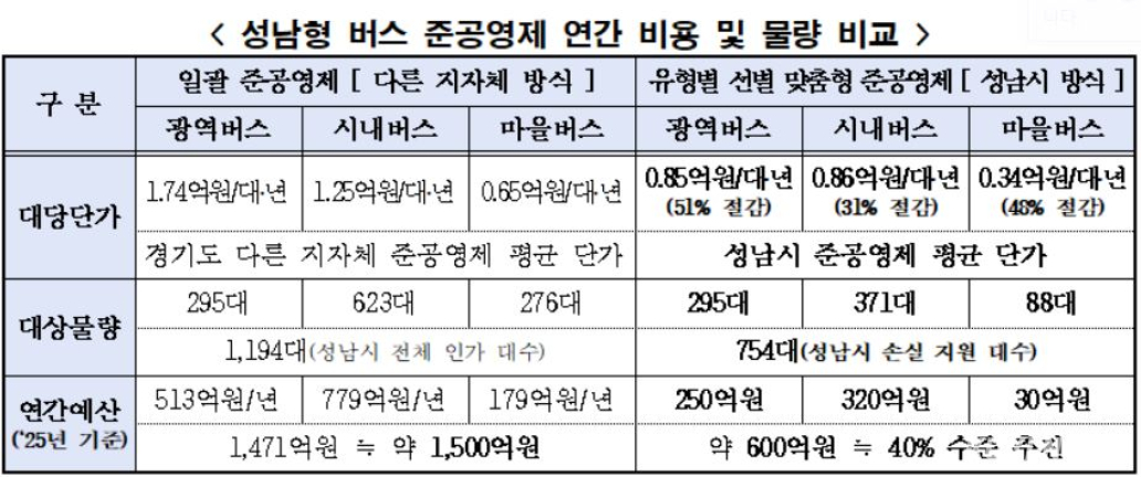 성남형 버스 준공영제는 모든 노선에 세금을 일괄 투입하던 과거 방식과 달리, 수익 노선은 민간이 운영하고 교통 소외지역이나 적자 노선만 시가 지원하는 방식이다.