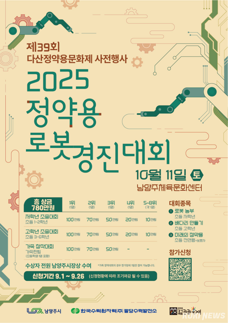 경기 남양주시가 전국 초등학생 및 가족 대상 ‘2025 정약용 로봇경진대회’ 참가자를 이달 26일까지 모집한다.