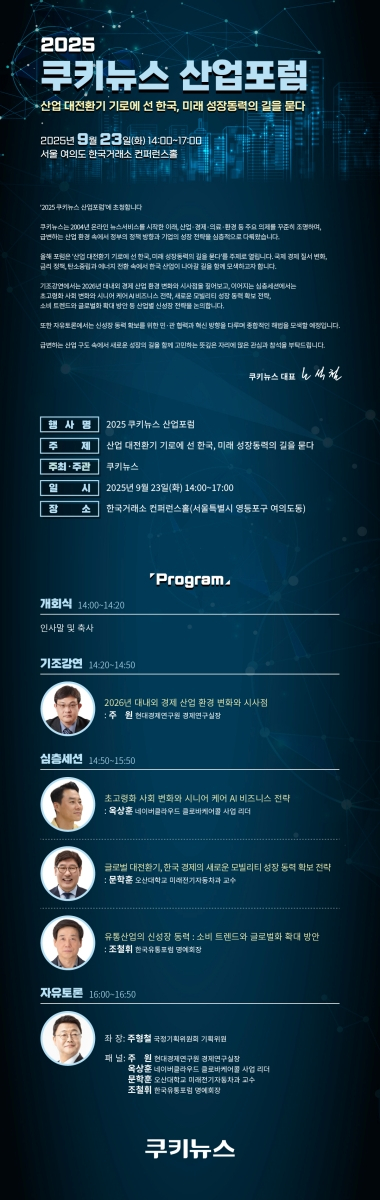세계 경제의 격랑 속에서 한국 산업의 생존 전략과 성장 동력을 모색하기 위한 ‘2025 쿠키뉴스 산업포럼’이 오는 9월 23일 열립니다.