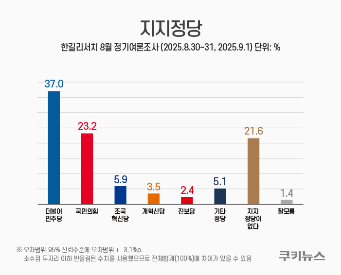 이어 조국혁신당 5.9%, 진보당 2.4%, 개혁신당 3.5%, 기타 정당 5.1%로 조사됐다. 지지정당이 없다고 응답한 무당층은 21.6%였다.