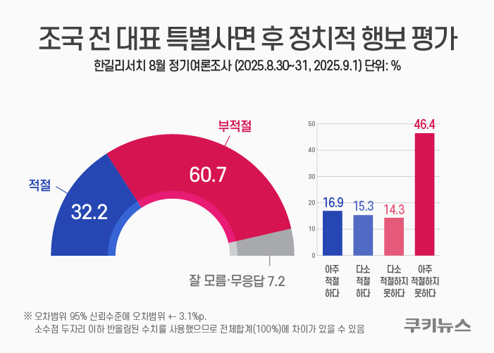 3일 쿠키뉴스 의뢰로 여론조사 전문기관 한길리서치가 지난달 30일부터 이번 달 1일까지 전국에 거주하는 만 18세 이상 남녀 1010명을 대상으로 ‘8·15 특별사면된 조국 전 조국혁신당 대표의 정치적 행보’에 대해 물은 결과, 응답자 60.7%는 부적절하다고 평가한 것으로 조사됐다. ‘아주 적절하지 못하다’는 답변은 전체 중 46.4%로 절반에 가까웠다.