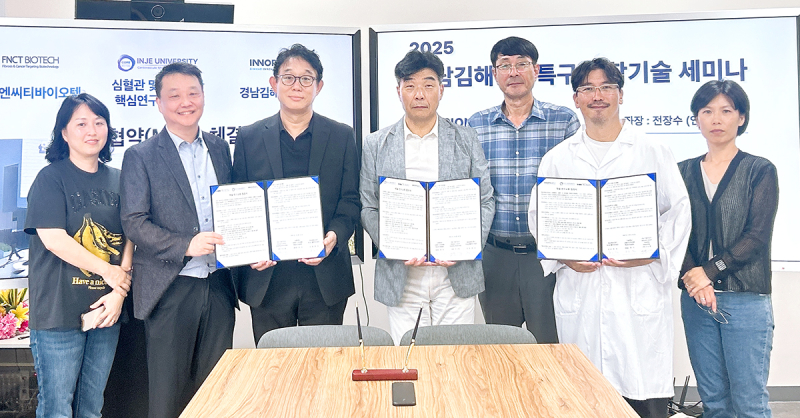 인제대 심혈관 대사질환 핵심연구지원센터와 김해강소특구사업단이 2일 에프엔시티바이오텍과 섬유화 치료제 개발을 위한 공동연구 협약을 체결했다. 협약은 인제대 한진 교수가 이끄는 연구팀이 주도했다.